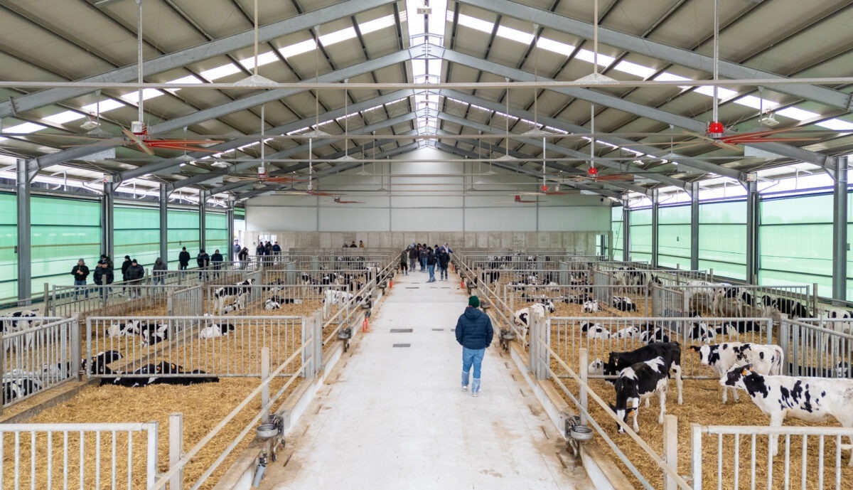 La nuova vitellaia è in grado di ospitare a pieno carico 500 animali, 250 vitelli 0-30gg e 250 capi dai 30gg fino ai 3/4 mesi di vita. La struttura ha una larghezza di 30m e si sviluppa su 100m di lunghezza, con un’altezza in gronda di 5m fino ad arrivare ai 10m del colmo. L’areazione e la luminosità dei locali è garantita, oltre che dalle dimensioni della struttura stessa e da un impianto di ventilatori, da un sistema di reti perimetrali a doppia apertura, dal basso verso l’alto e dall’altro verso il basso, e dall’applicazione di un cupolino con copertura in policarbonato che permettono l’irraggiamento all’interno della struttura e un ricambio d’aria costante.